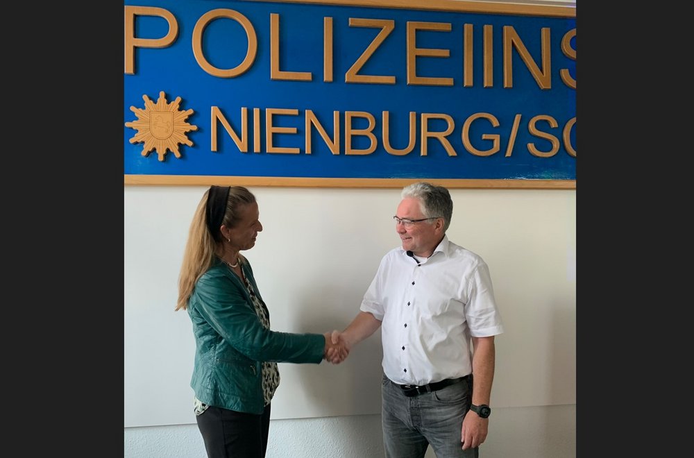 Darüber hinaus besuchte die Bundestagsabgeordnete Keul die Polizeiinspektion Nienburg-Schaumburg. Seit Mitte August ist dort Kriminaldirektor Stefan Schara der neue Inspektionsleiter in Nienburg. Keul berichtet im Gespräch, dass sie besorgt zurückschaut auf die letzten Wochen. "Es kam vermehrt zu Schmierereien und Angriffen gegen Geschäftsstellen der Grünen und sogar gegen grüne Politiker*innen selbst. Auch mein Wahlkreisbüro in Stadthagen war bereits zwei Mal betroffen." So ließe sich beobachten, dass engagierte Parteifreund*innen aus Angst vor Bedrohung nicht für ein Mandat kandidieren oder sogar bereits gewählte Mandatsträger*innen zurücktreten, berichtet die heimische Bundestagsabgeordnete. "Mir ist es wichtig, dass sich gerade ehrenamtliche Mandatsträger*innen in sicher fühlen. Solche Bedrohungen können große Auswirkungen auf unsere Demokratie haben und das dürfen wir nicht zulassen," so Keul. Die Debattenkultur habe sich verändert, beobachtet auch Herr Schara: "Auf der Demokratie kann man sich nicht ausruhen, sondern wir müssen alle gemeinsam uns immer wieder neu dafür stark machen." Das Projekt "Polizeischutz für Demokratie" hat genau dieses zum Ziel. So beinhaltet es beispielsweise Aufklärungsarbeit innerhalb der Polizei aber auch Präventionsangebote nach außen. Es gibt von der Polizeiinspektion Nienburg- Schaumburg bereits Angebote und eine feste Ansprechperson speziell für Mandatsträger*innen. "Wichtig ist, dass sich die angegriffenen Personen direkt an uns wenden. Wir gehen diesen Anzeigen immer nach. Nur wenn wir in Kenntnis sind, können wir angemessen reagieren," erklärt der Kriminaldirektor.